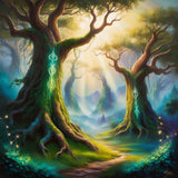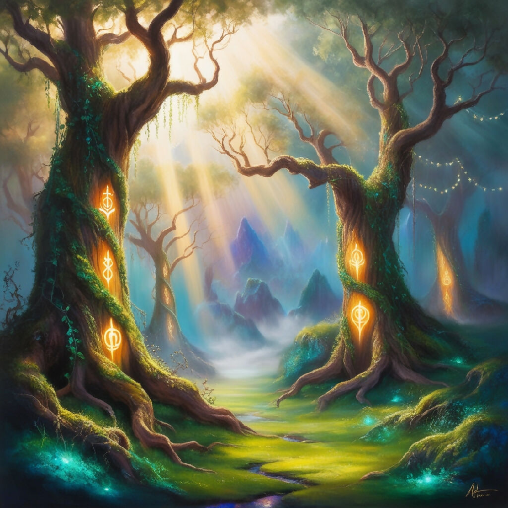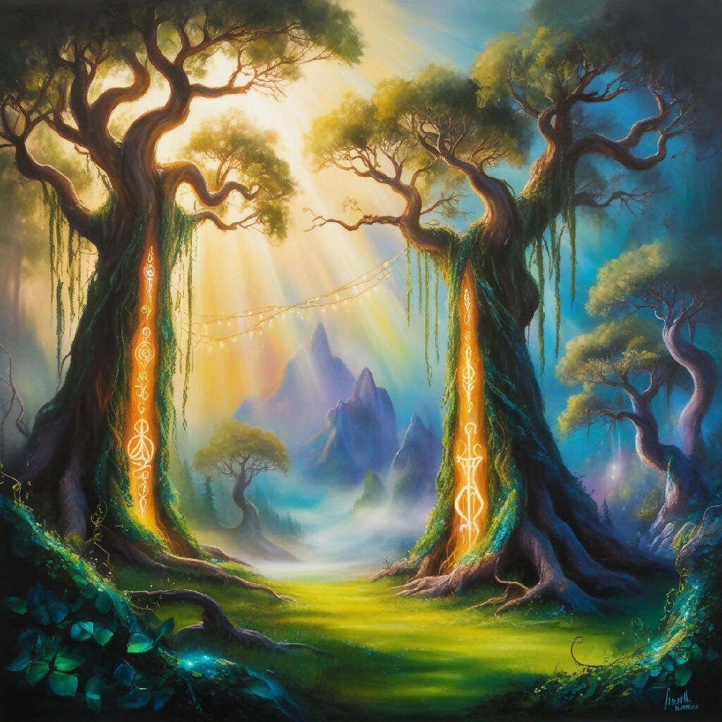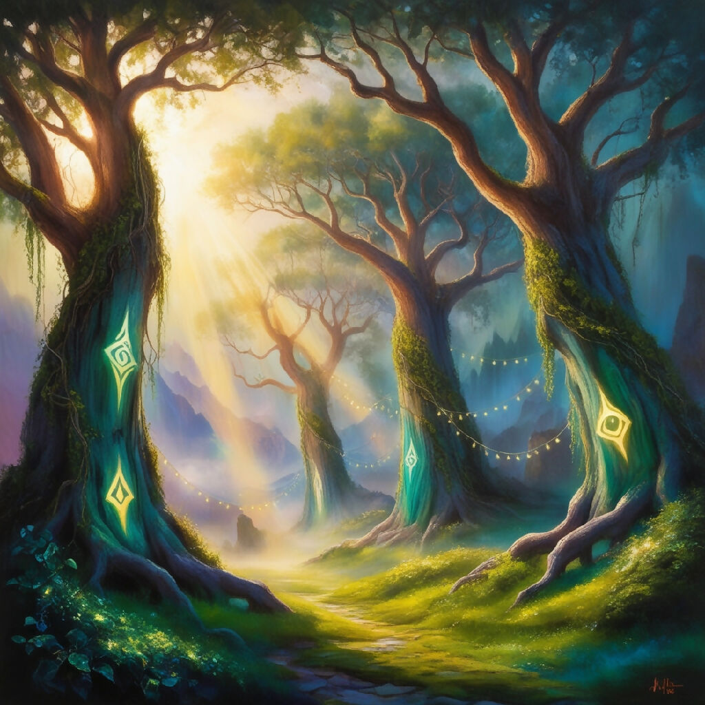 Vibrant fantasy landscape in oil paint, depicting a mystical realm where ancient trees with gnarled branches stretch towards the sky, their trunks adorned with glowing ethereal symbols. Warm rays of golden light filter through the misty atmosphere, casting an otherworldly glow on the scene. The colors palette is a fusion of emerald greens, sapphire blues, and iridescent hues, evoking a sense of wonder and magic. Additional details include delicate vines snaking up the trees, shimmering fairy lights dancing on the breeze, and a hint of misty fog rolling in from the distant mountains. in short