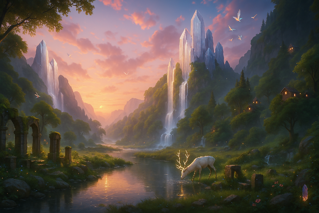 Step into a breathtaking world of magic and wonder with this fantasy nature landscape artwork. Featuring glowing crystal mountains, cascading waterfalls, and a luminous stag drinking from a river at sunrise, this piece captures the perfect harmony of nature and mystery. Ancient moss-covered ruins, glowing fireflies, and enchanted cottages nestled in the forest complete the dreamlike scene.