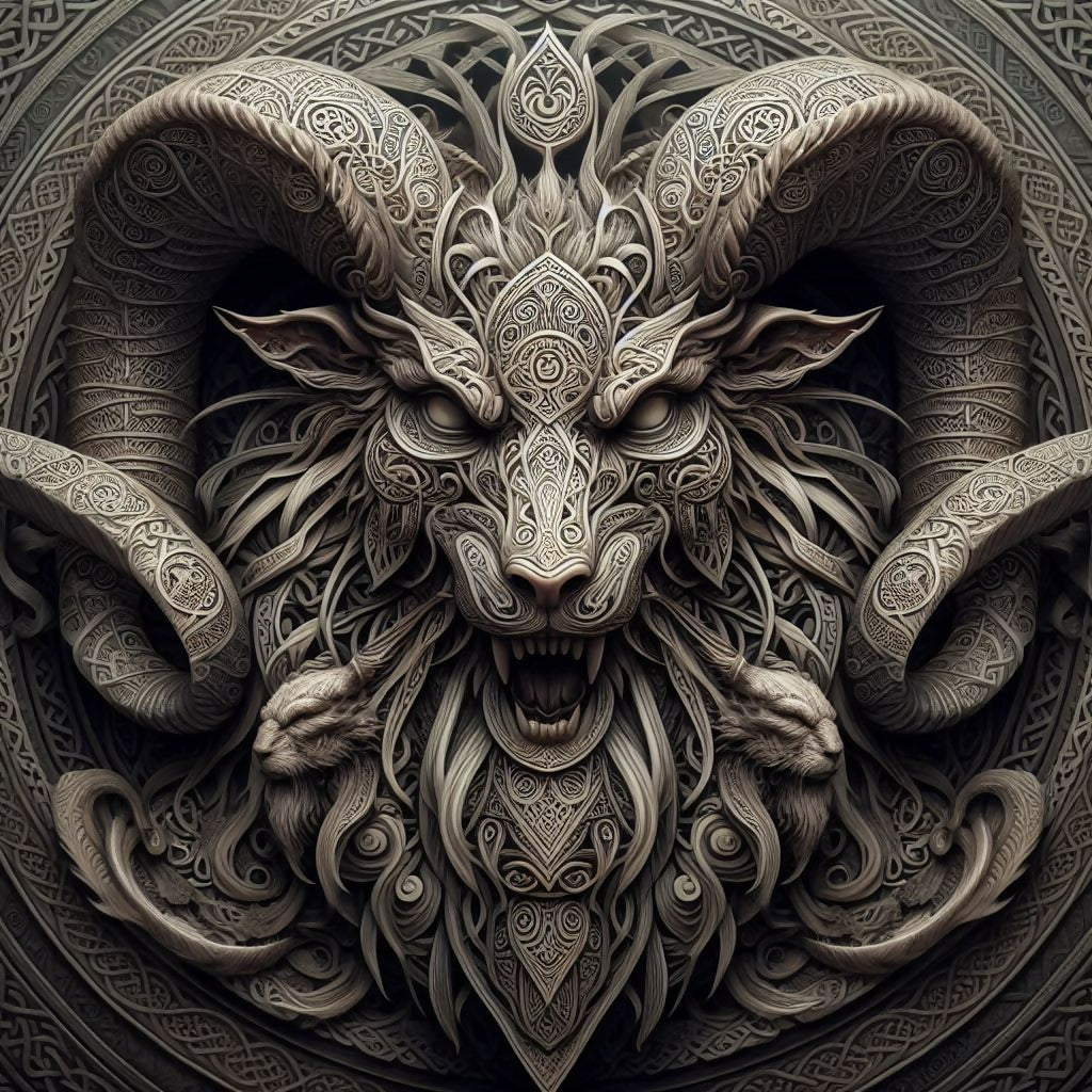 Tags: Mythical, Horned Creature, Lion, Goat, Fantasy, Ornate, Symmetrical, Tribal, Decorative, Fierce, Guardian, Ancient, Patterned, Black and White, Line Art