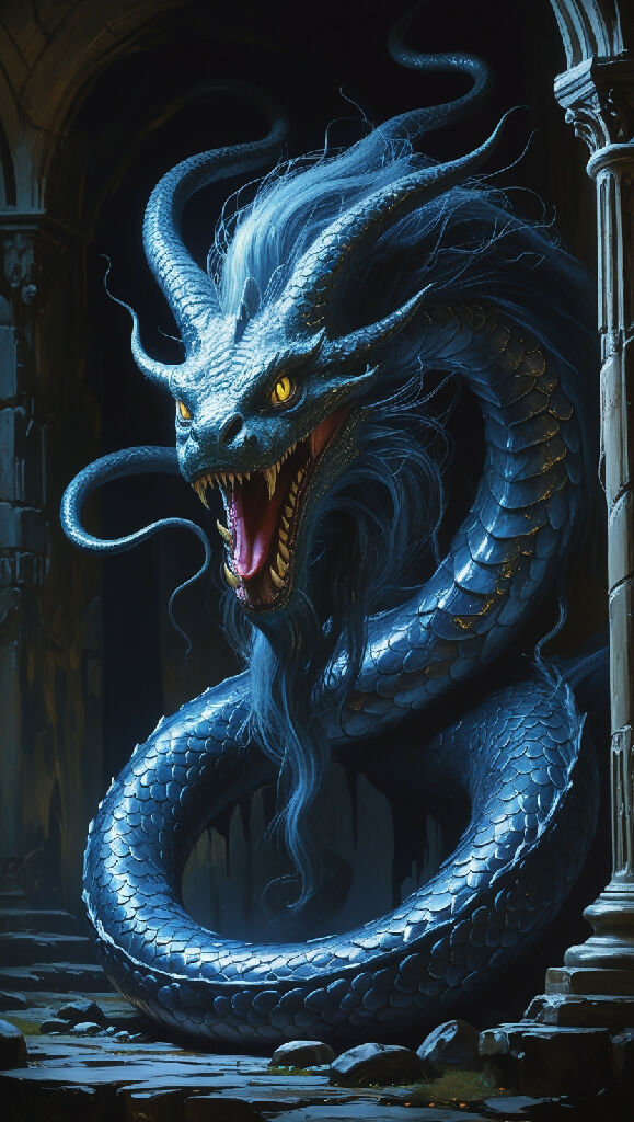 A fierce fantasy artwork depicting a serpentine dragon, reminiscent of an East Asian style but with a menacing appearance. The dragon is a metallic blue-gray with thick scales and has long, dark blue hair/mane flowing from its head and neck. Its mouth is open, revealing sharp fangs and a red tongue, and its yellow eyes glow in the dark. The setting is a ruined, abandoned castle chamber with stone pillars.