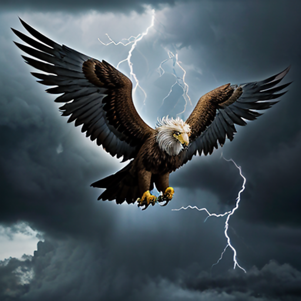 Illustrate a mythical griffin with the body of a lion and the head and wings of an eagle, soaring through a dramatic, stormy sky with lightning illuminating its powerful form