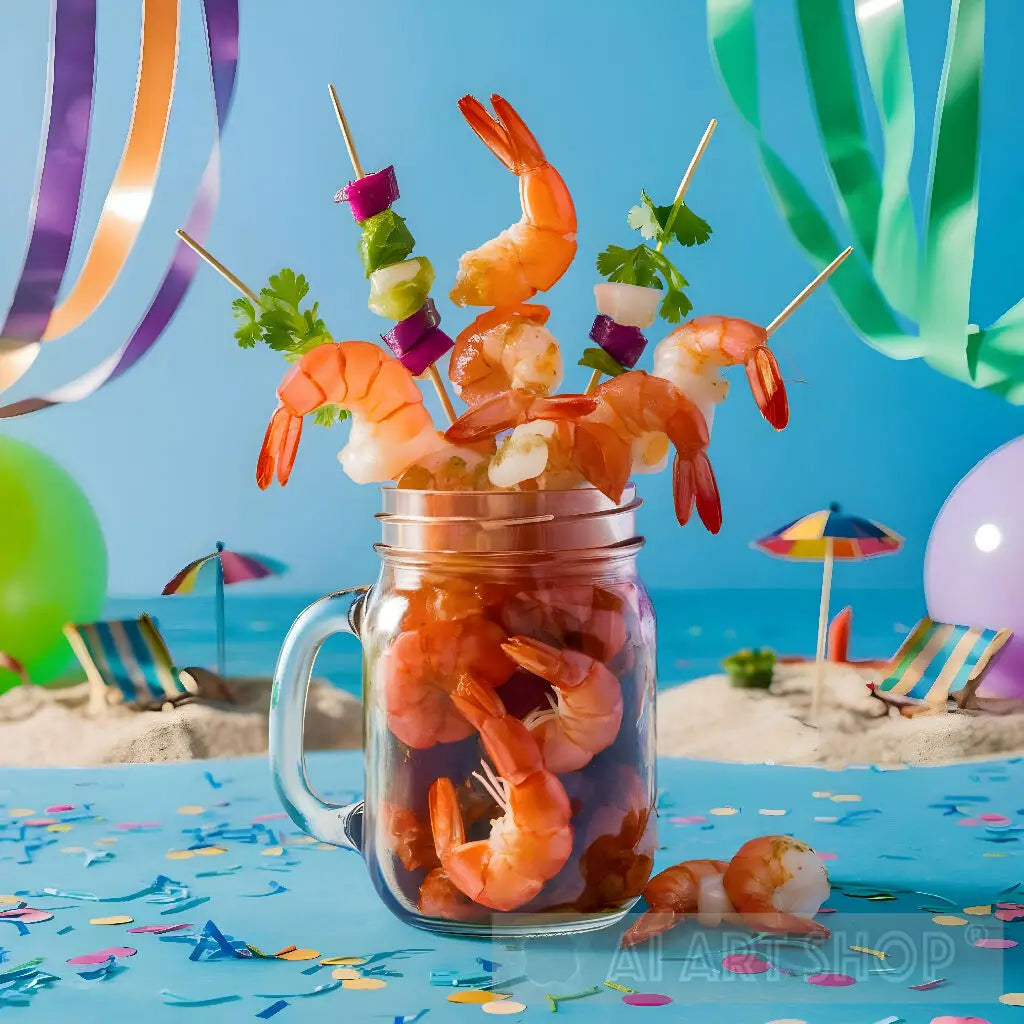 Foreground: Arrange the shrimp creatively! Some can stand upright, tails fanned out, others scattered playfully. Include a variety of colors—use peeled shrimp with cocktail sauce, skewered shrimp with vibrant herbs like cilantro and parsley, and perhaps even a few with a light dusting of edible glitter for an extra pop.