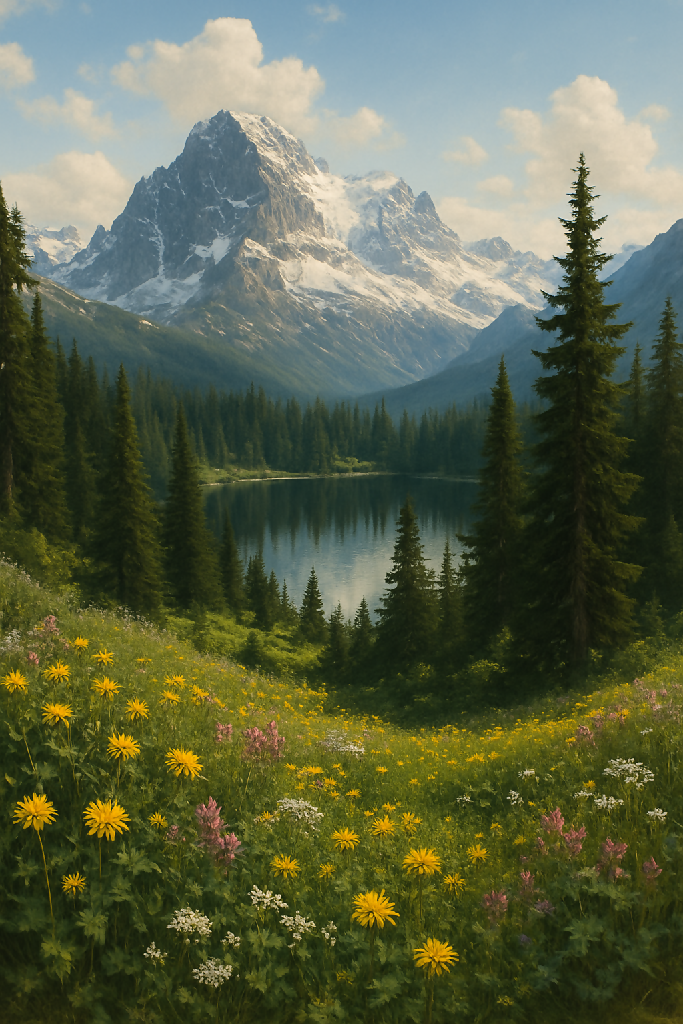 Diese beiden KI-generierten Kunstwerke fangen die ruhige Schönheit der Natur ein. Beide Bilder zeigen majestätische, schneebedeckte Berge, die sich im Hintergrund erheben, während ein ruhiger See das Zentrum bildet. Dichte Nadelwälder säumen die Ufer und Hänge, und im Vordergrund erstreckt sich eine farbenprächtige Blumenwiese. Die Bilder strahlen eine idyllische Ruhe aus, als wären sie direkt aus einem Traum entstanden. Die AI hat die Fähigkeit gezeigt, atemberaubende Landschaften mit einer malerischen Qualität zu erschaffen, die sowohl realistisch als auch idealisiert wirken.