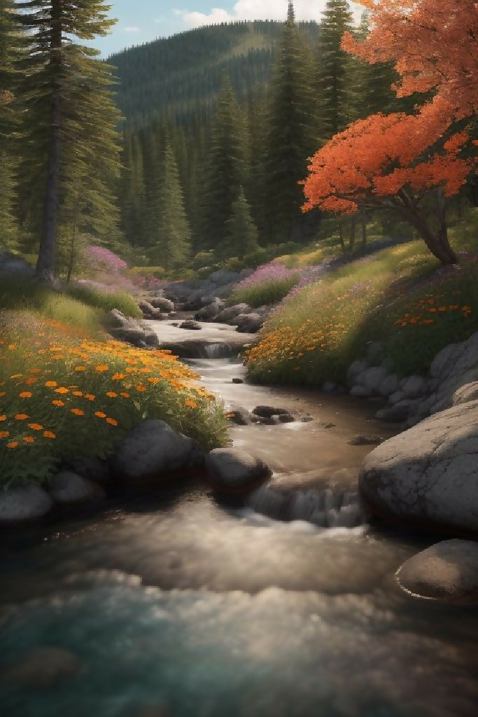 The rolling hills are covered in lush forests with deep greens and warm autumn hues, while the distant peaks stand tall and rugged under a vivid blue sky dotted with soft, stylised clouds in shades of pink and peach. Framing the composition are tall pine trees on either side, enhancing the sense of depth and serenity in the scene.