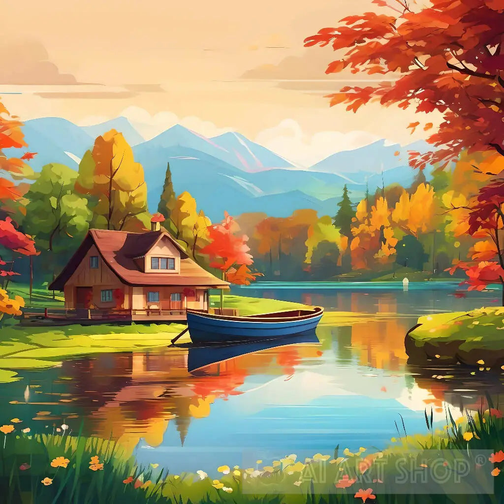 Nature Landscape with Lake, Cottage And Trees