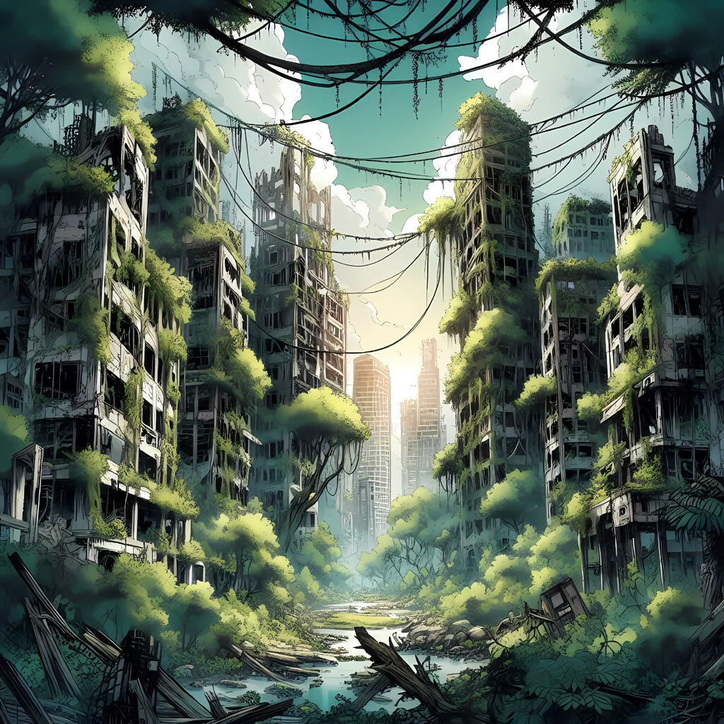 In a hauntingly beautiful twist of fate, Nature Reclaims the Concrete Veins captures the moment when urban decay gives way to organic rebirth. This AI-generated landscape art portrays a forgotten cityscape where vines, moss, and trees erupt from shattered windows and broken rooftops, weaving a tapestry of resilience across steel and stone. The golden light in the distance hints at hope—a new dawn rising beyond the ruins. This piece tells the story of time’s quiet rebellion, where nature triumphs over human ambition, reclaiming its rightful place in the heart of civilization.
