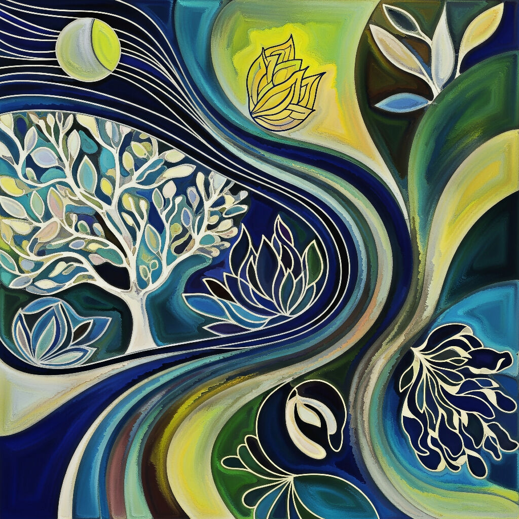 This image is a vibrant and abstract representation of nature, featuring various organic elements. At the center, a stylized tree with branches and leaves is depicted in shades of blue, green, and white. Surrounding the tree are intricate floral motifs, including lotus-like flowers and leaves, all outlined in white. The background consists of swirling colors—primarily blues, greens, and yellows—creating a dynamic sense of movement and fluidity. In the upper left corner, a moon with radiating lines adds a celestial touch to the composition. The overall effect is harmonious and flowing, capturing nature's interconnectedness beautifully.