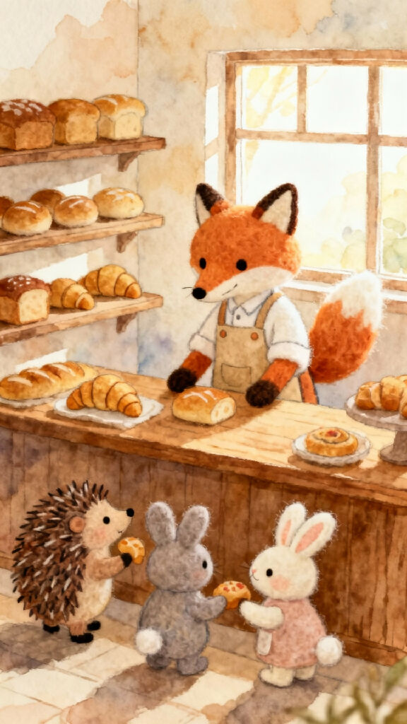 Needle-felted woodland animals inside a tiny cozy bakery. Felted fox baker wearing a little apron, hedgehogs and bunnies choosing pastries. Soft muted warm tones, shelves with tiny felted breads and croissants, handmade wool textures everywhere, wooden counter, warm window light, fluffy cozy atmosphere, storybook illustration, watercolor background.