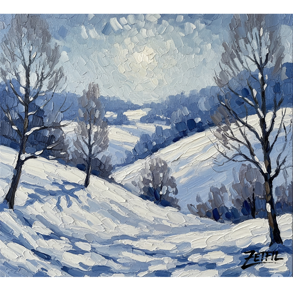 L'œuvre est dominée par des tons froids de bleu, de blanc et de gris, qui créent une atmosphère calme et paisible. Les différentes nuances de bleu donnent de la profondeur aux ombres des arbres et des collines, tandis que le blanc éclatant de la neige est mis en valeur par la lumière vive du soleil. Les arbres, aux branches nues, se dressent en premier plan et ajoutent de la structure au paysage.