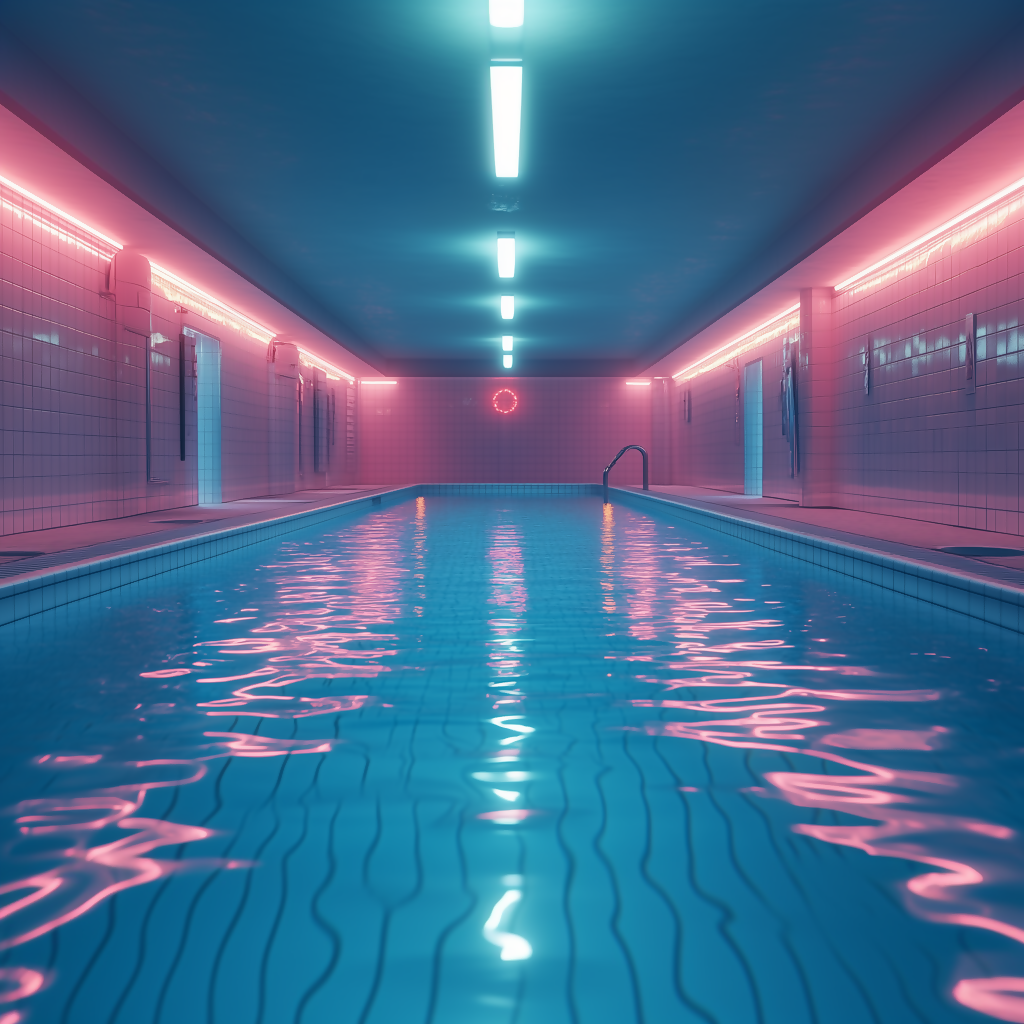 This is vaporwave aesthetics at its most sophisticated...channeling the haunting beauty of abandoned pools, retro-futurism, and those liminal moments when nostalgia becomes tangible. The glowing neon lighting creates an atmosphere that's simultaneously unsettling and irresistibly magnetic, like a David Lynch film frozen in perfect composition.
