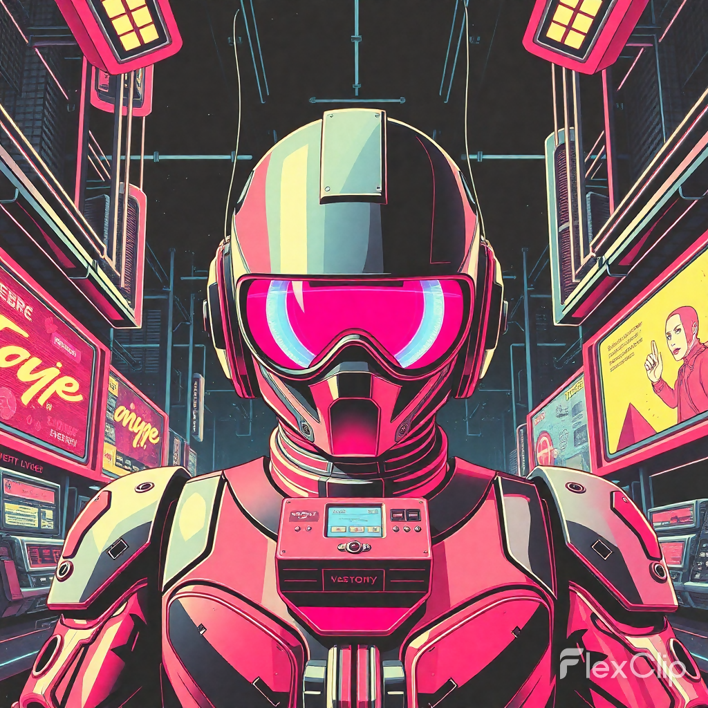 In a bustling cyberpunk alleyway, a figure wearing a high-tech helmet and suit monitors the surroundings. Flashing neon signs illuminate the scene, evoking a sense of both wonder and gritty urban life.
