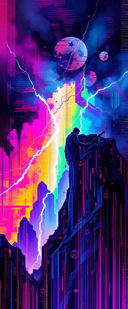 A cyberpunk-inspired digital artwork depicting a figure standing on a futuristic rooftop with vibrant neon city buildings in the foreground, illuminated by lightning bolts and celestial planets in the colorful sky. The blend of deep purples, blues, and bright rainbow hues creates a dynamic sci-fi atmosphere with a focus on futuristic urban themes.