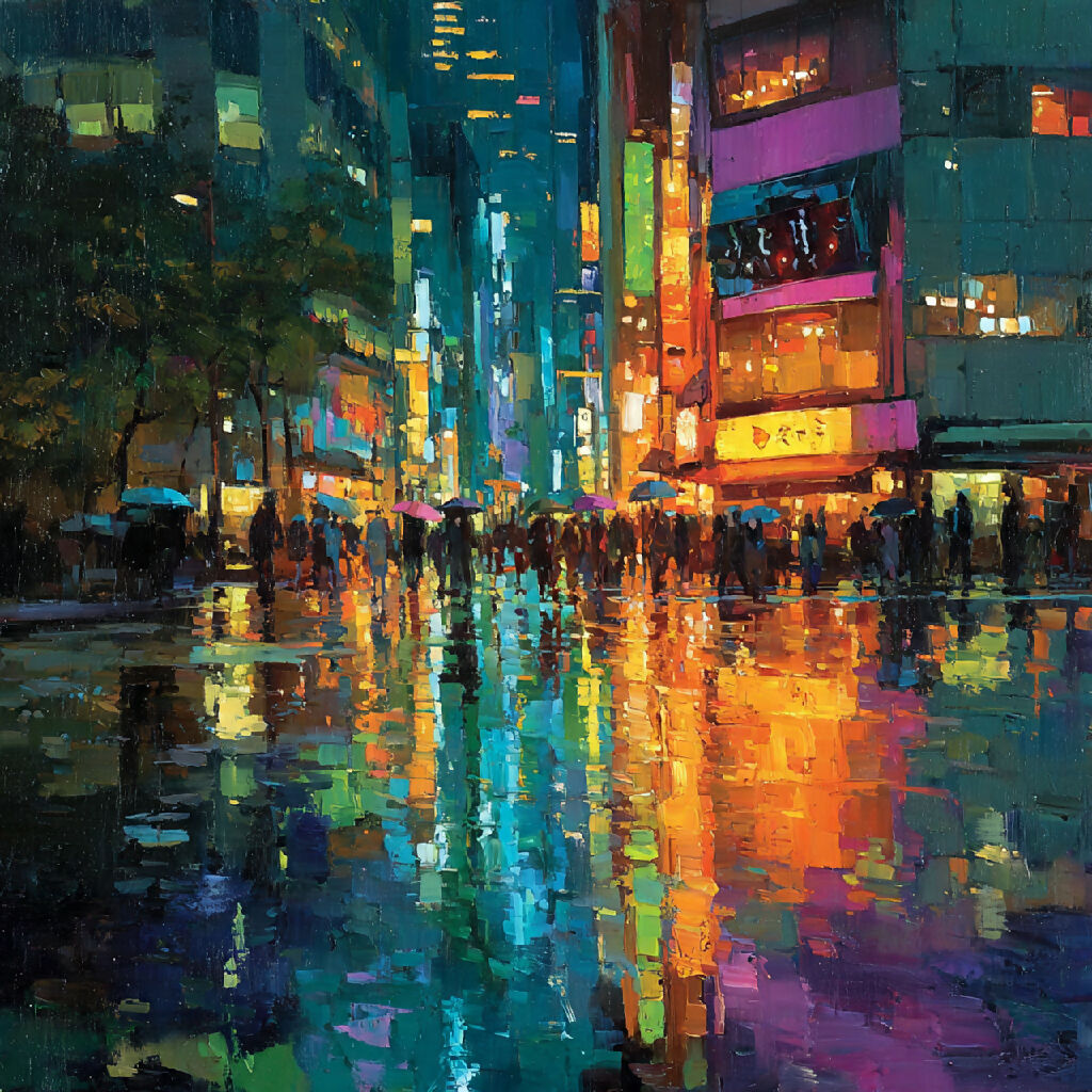 A luminous, expressive oil painting of Tokyo’s rain-soaked streets at night — where neon signs explode in magenta, lime, and electric blue, bleeding into puddles that mirror the city’s vibrant soul. Silhouettes of umbrella-clad figures drift through the glow, while thick brushstrokes capture the energy, rhythm, and mystery of urban life. A symphony of light, color, and motion alive with emotion and electric poetry