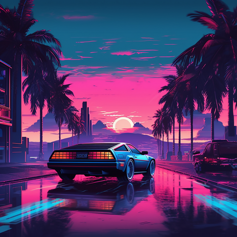 A synthwave sunset ride through neon streets. Bold, cinematic, and nostalgic—perfect for retro lovers chasing the horizon.
