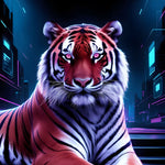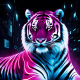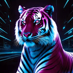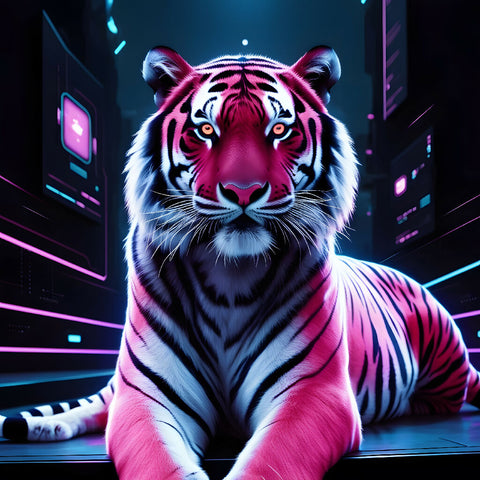 This modern art piece features a majestic tiger adorned with neon stripes. Set against a dark, futuristic cityscape filled with glowing lights and digital elements, the tiger's fur boasts a holographic sheen, and its eyes emit a soft, neon glow. This artwork masterfully combines the awe-inspiring beauty of nature with the captivating allure of a high-tech urban environment, creating a visually stunning and conceptually rich masterpiece.
