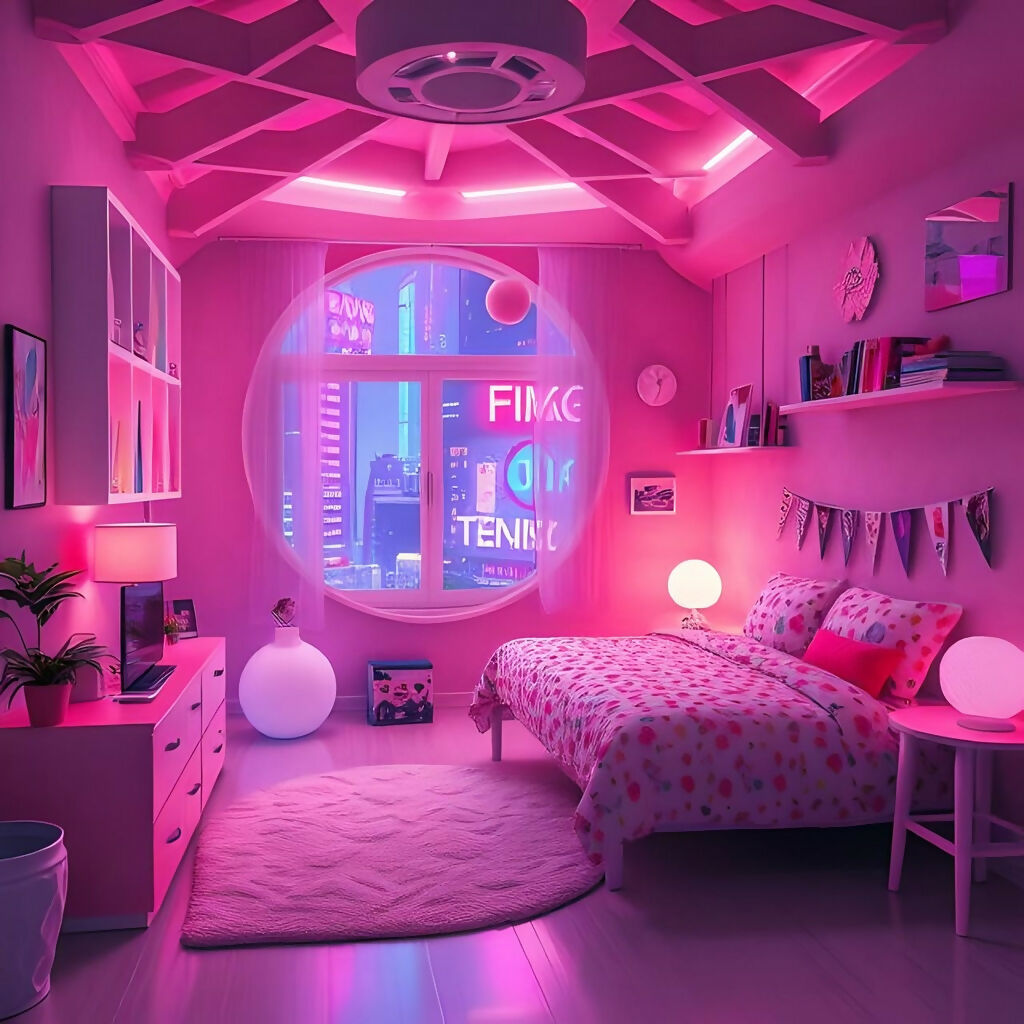 This AI-generated artwork captures the charm of a futuristic bedroom bathed in vibrant pink and purple hues. A large circular window reveals a neon-lit cityscape, while sleek furnishings and playful details—like polka dot bedding, bunting, and glowing orb lights—create a cozy, modern atmosphere. The blend of soft textures and sci-fi aesthetics makes this piece perfect for lovers of imaginative interiors and dreamy urban escapes.
