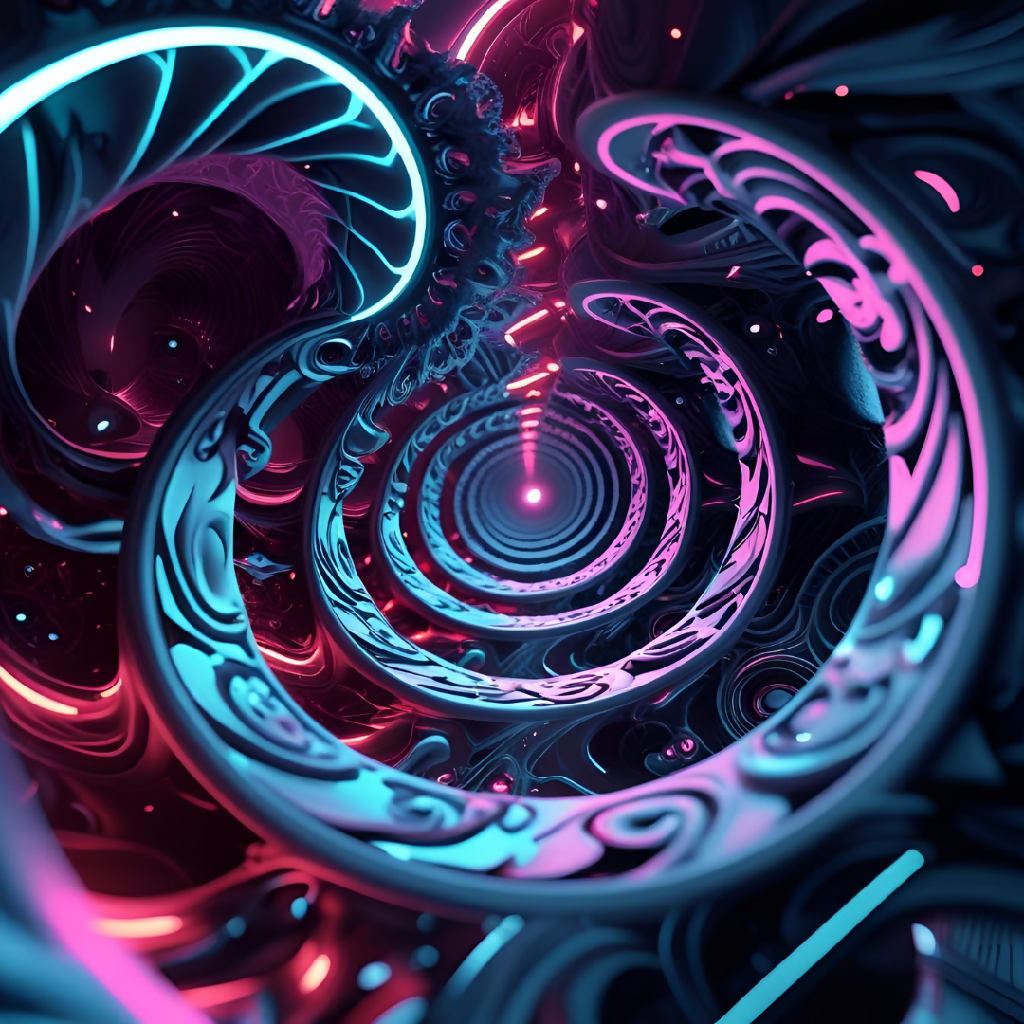 A mesmerizing abstract vortex of glowing rings in vibrant neon hues of cyan, pink, and red. The repeating circular forms create a sense of depth, drawing the viewer into a seemingly endless tunnel of light and intricate patterns. The interplay of light and shadow adds to the image's dynamic and futuristic feel.