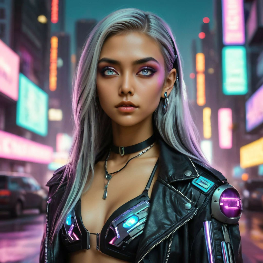 A stunning woman glows under vibrant neon lights in this captivating portrait, set against a futuristic cyberpunk cityscape. Her delicate beauty merges seamlessly with the high-tech world, as neon reflections dance in her eyes. This artwork blends elegance and innovation, offering a mesmerizing glimpse into a tomorrow where humanity and technology intertwine.