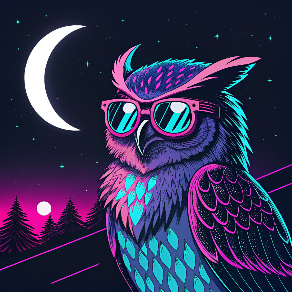 A retro-futuristic digital illustration of an owl wearing sunglasses, set against a vibrant night sky with a crescent moon. The piece features a bold color palette of neon pinks, blues, and purples, and a combination of geometric shapes and organic forms. The owl's cool and confident expression adds a touch of whimsy to the image. Step into a retro-futuristic world with this vibrant digital illustration of a cool owl wearing sunglasses. Set against a starry night sky with a crescent moon, this piece combines bold neon colors and geometric shapes for a truly eye-catching design. Perfect for adding a touch of whimsy and nostalgia to any space.
