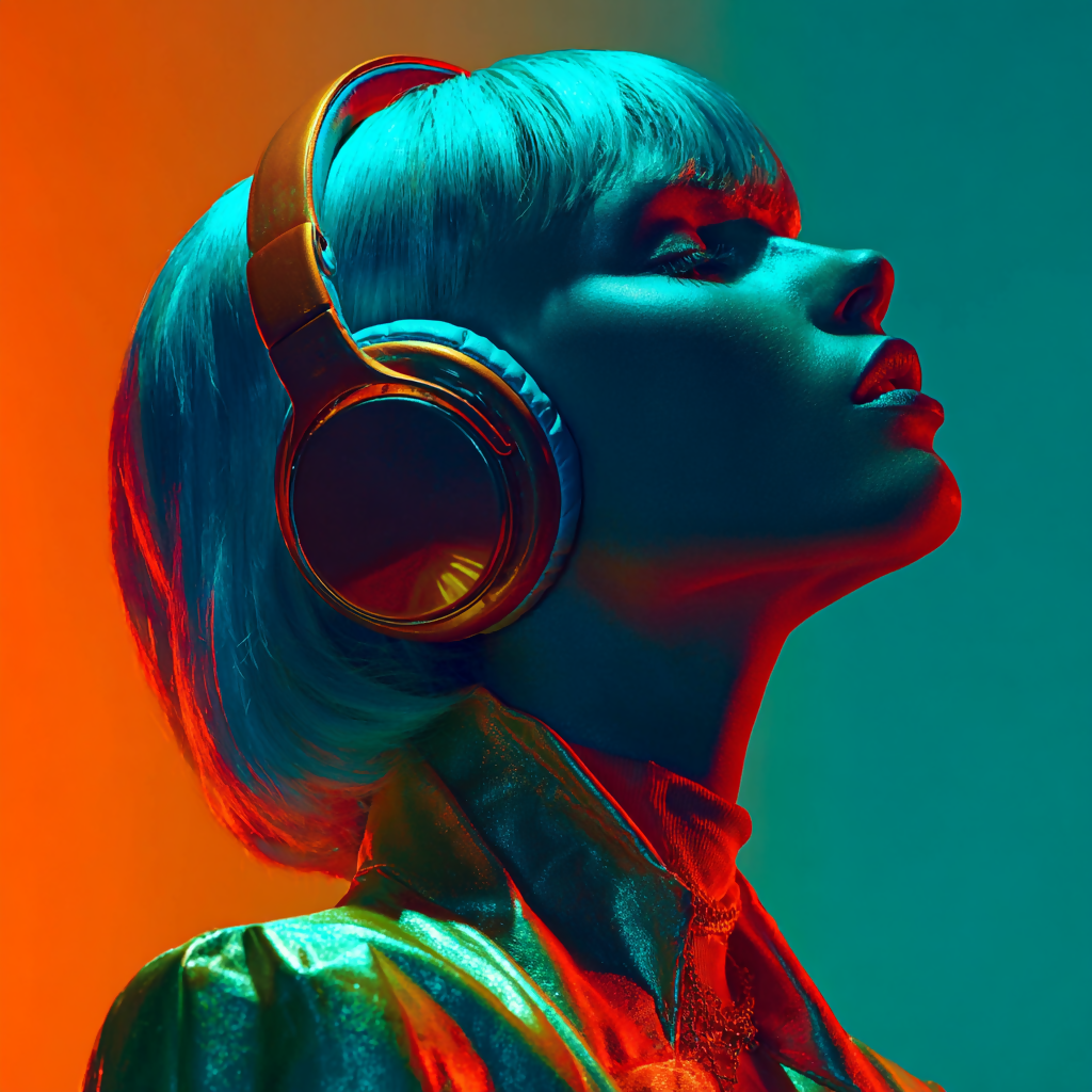 Tags: Headphones, Cyberpunk, Blue Hair, Neon Lights, Futuristic Fashion, Music Vibes, Portrait Photography