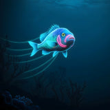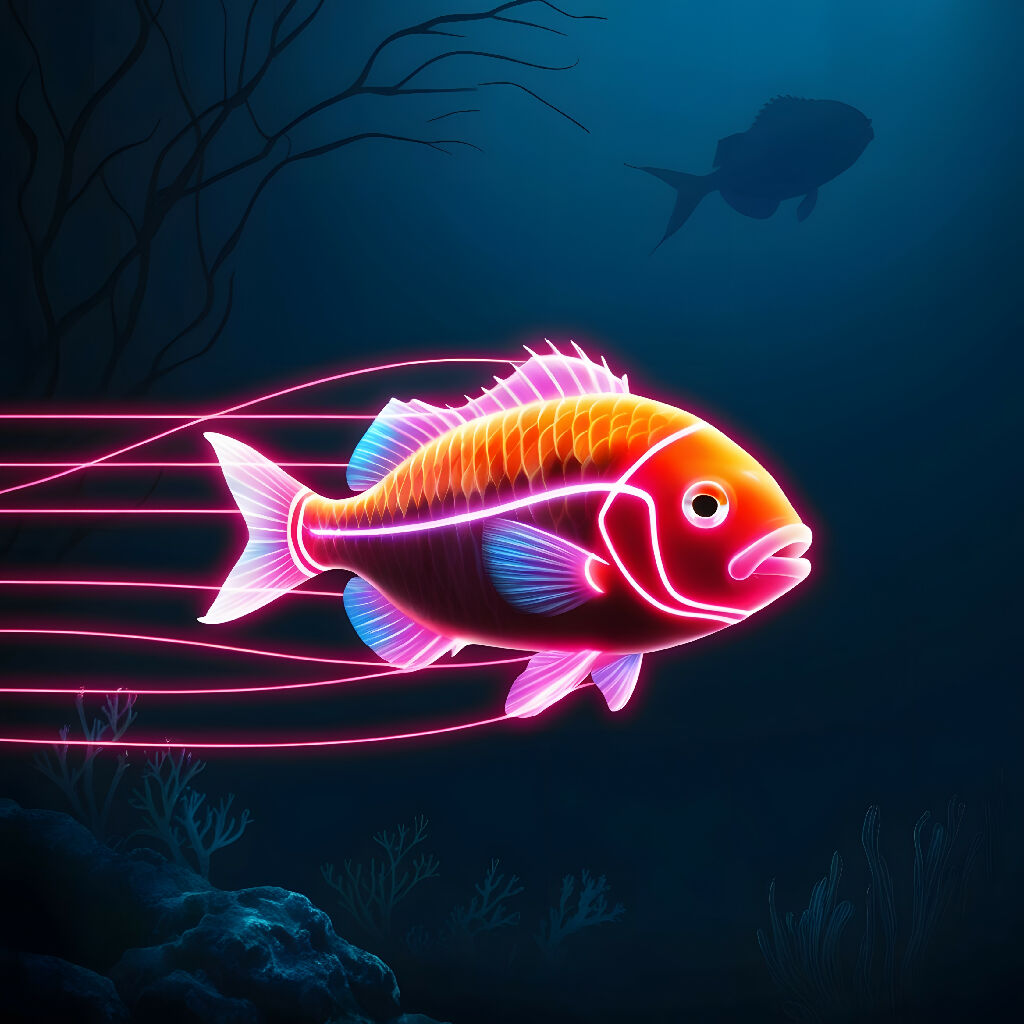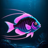 Explore the mesmerizing beauty of 'Neon Radiance,' an image that captures a glowing fish in a dark, underwater realm. This ethereal fish, adorned with luminescent scales, illuminates the deep blue waters with vibrant neon colors, creating a stunning contrast against the shadowy depths. Trails of light follow its graceful movements, adding a dynamic and magical quality to the scene. The background is subtly adorned with faint silhouettes of underwater plants and corals, enhancing the sense of immersion and tranquility. This captivating artwork invites you to delve into an otherworldly aquatic landscape where light and color intertwine.