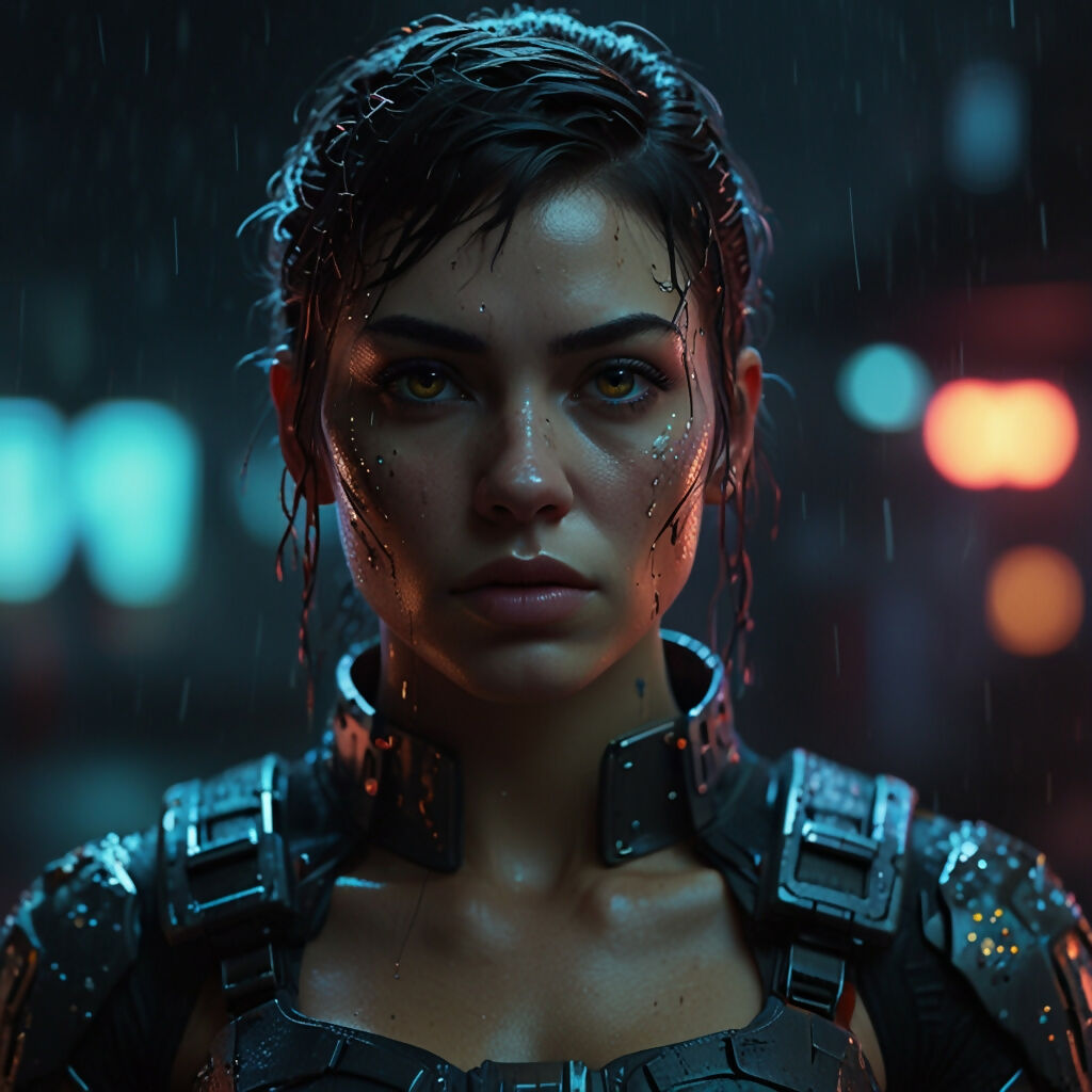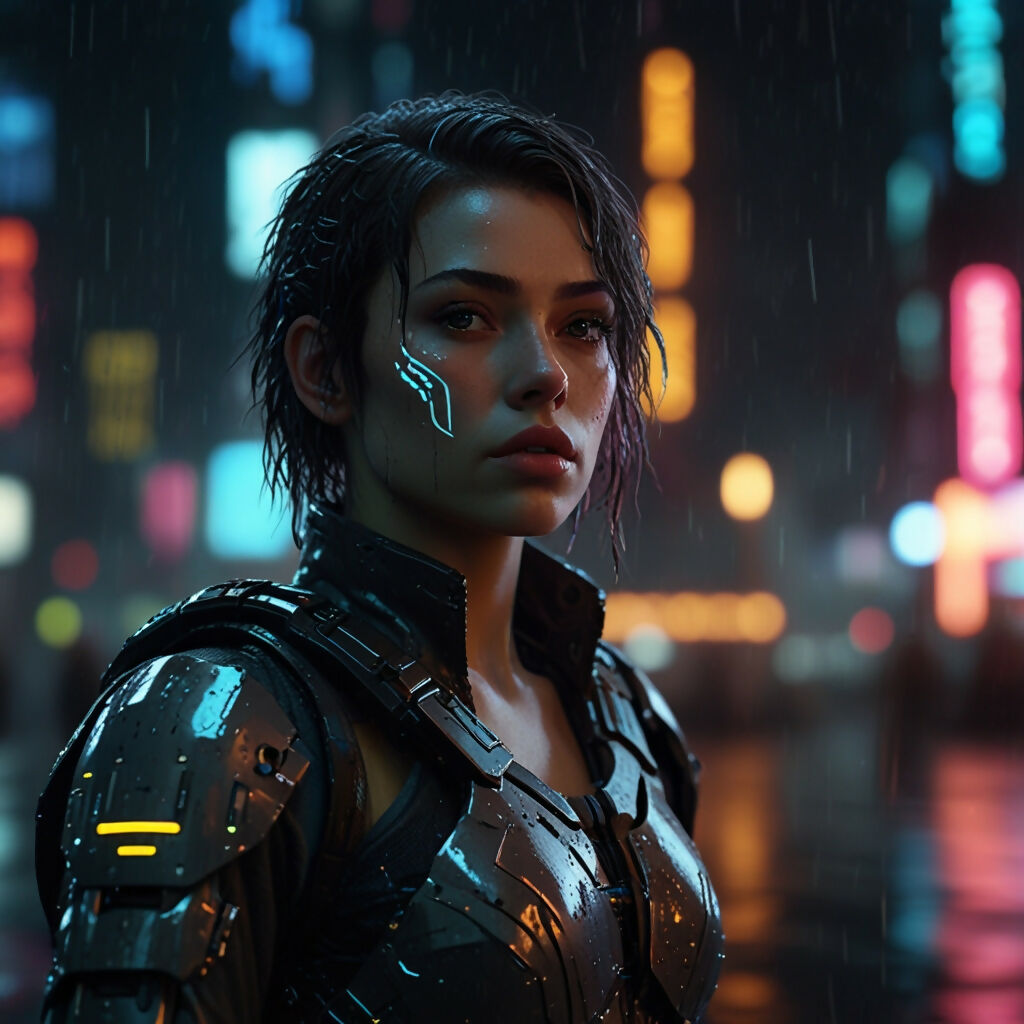 A highly detailed, cinematic portrait of a futuristic female warrior standing in the rain at night. She wears sleek, black cyberpunk armor with glowing orange neon lines on her shoulder and subtle reflections on the metallic surfaces. Her face is focused and intense, marked with glowing cybernetic implants that trace along her cheek. Her short, wet hair is slicked back, and the background features a futuristic cityscape with blurred neon lights in various colors — blue, pink, yellow — evoking a “Blade Runner”-style atmosphere. The rain enhances the moody, immersive sci-fi aesthetic.