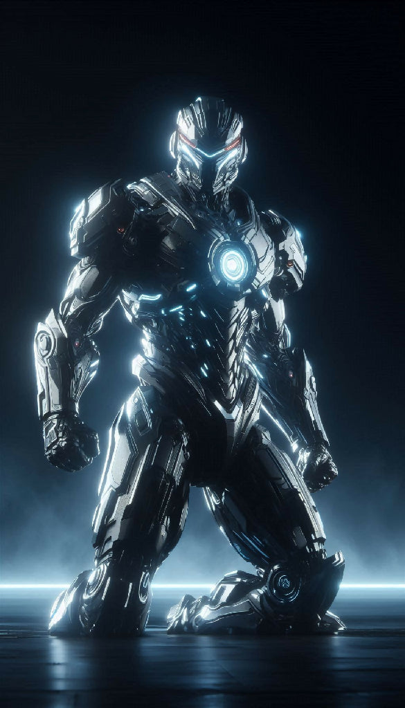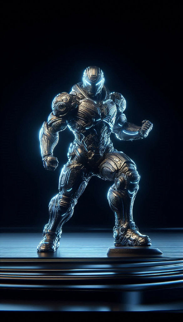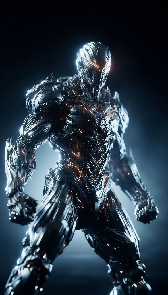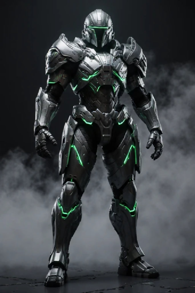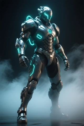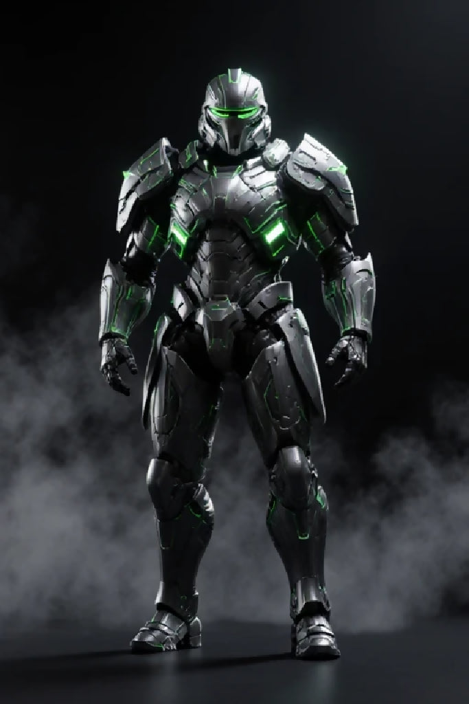 This 3D model showcases a futuristic armored warrior in a dynamic battle-ready pose. Designed with intricate metallic textures and glowing neon accents, the model emphasizes highly detailed armor, realistic cloth, and photorealistic materials. The scene is rendered in 8K using Octane Render, featuring cinematic lighting, sharp shadows, and volumetric fog to create a dramatic and immersive atmosphere.