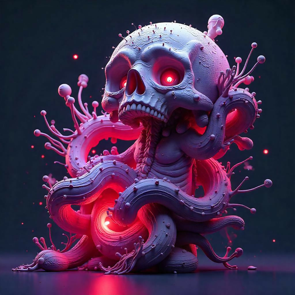 This mesmerizing artwork features a surreal fusion of a human skull and organic, tentacle-like forms that seem to grow and twist around it. The entire sculpture glows with vibrant neon pink and red hues, giving it an otherworldly, almost alien appearance. The skull’s eye sockets and the core of the twisting tendrils emit a powerful red light, creating an intense, haunting focal point. The background is dark, which makes the luminous elements stand out even more, enhancing the eerie yet captivating atmosphere of the piece.