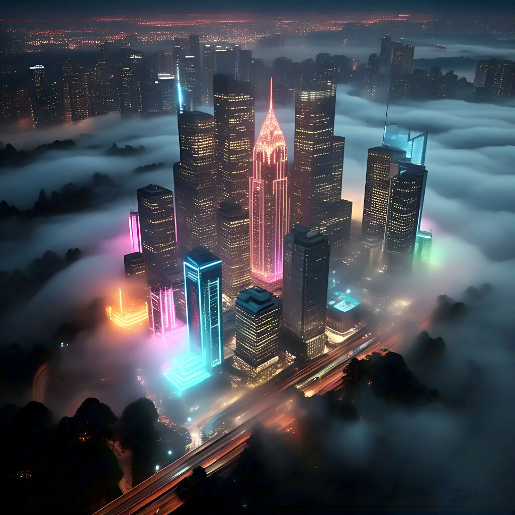Step into a dreamscape of urban wonder with Neon Skyline in the Mist, a captivating AI-generated artwork that reimagines the architecture of the future. Skyscrapers glow in vibrant hues of neon pink, electric blue, and sunset orange, shrouded by an ambient layer of mist that adds depth and drama. The composition captures a striking balance between realism and futurism, portraying a bustling metropolis through a surreal lens. Ideal for enthusiasts of modern city aesthetics and sleek architectural themes, this piece brings dynamic energy and visual intrigue to any space.
