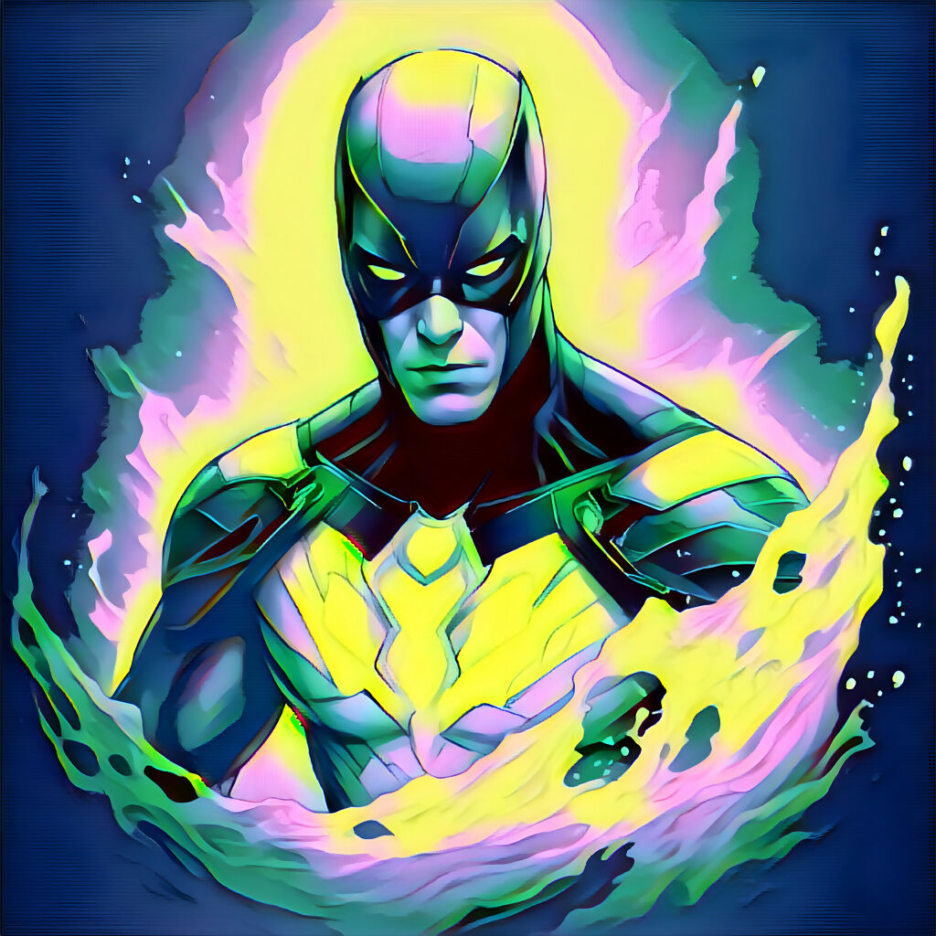 This stunning AI-generated artwork showcases a futuristic superhero in dynamic neon hues. The detailed armor and glowing accents create a visually striking effect, making it an excellent choice for enthusiasts of modern digital art and superhero themes. This piece brings energy and vibrancy to any space, ideal for collectors and fans of bold artistic expression.
