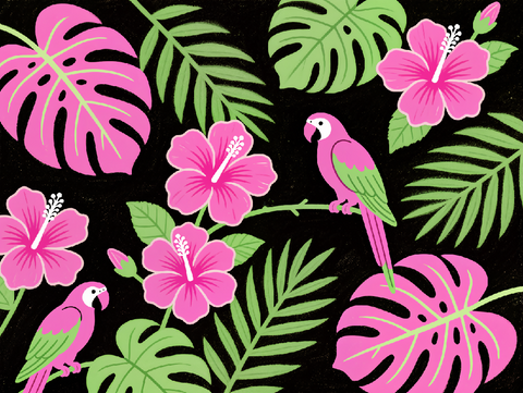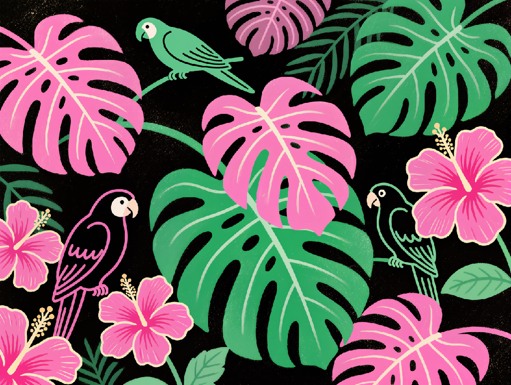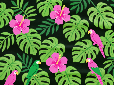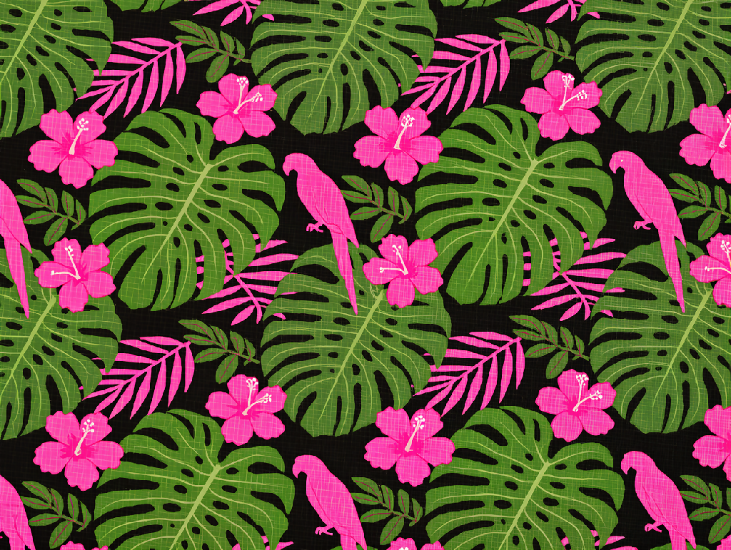 Neon pink and green monstera leaves, hibiscus, and parrot silhouettes pop against matte black, with grainy texture adding depth to this bold fabric.