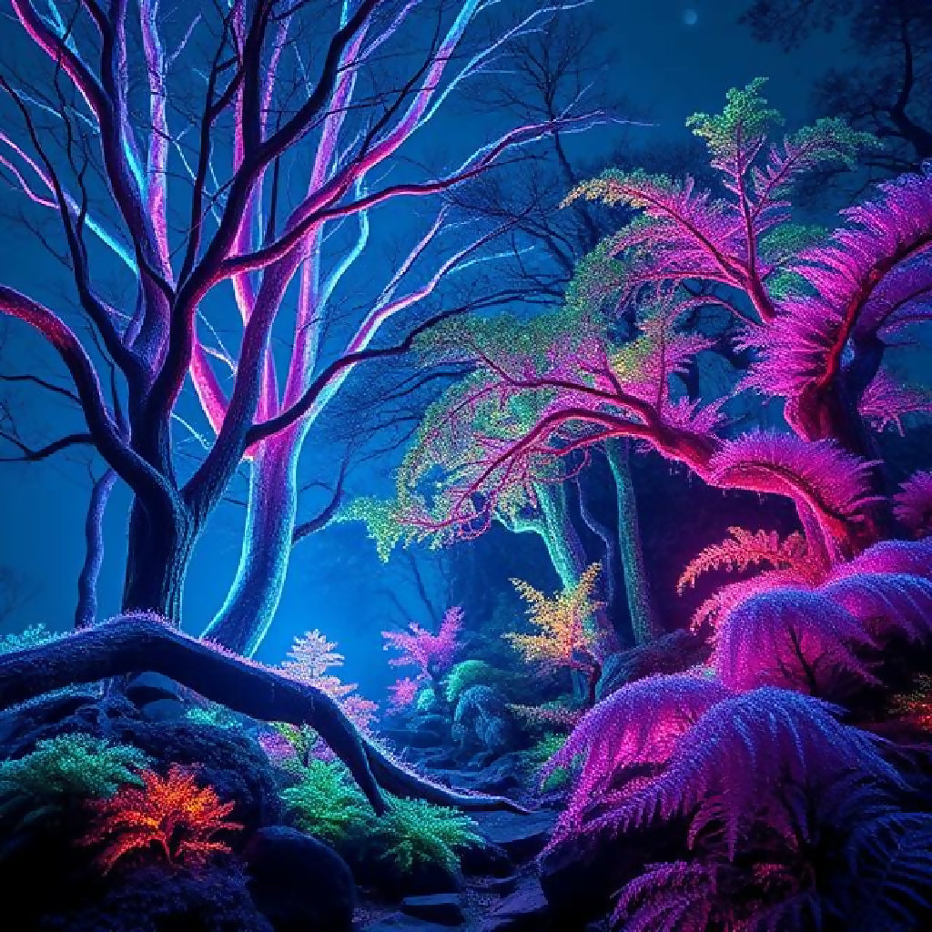 This captivating image transports you to a surreal forest bathed in vibrant neon hues. Towering trees glow with electric blues, purples, and pinks, while lush ferns radiate with iridescent greens and oranges. The otherworldly scene evokes a sense of mystery and wonder, inviting viewers to explore this fantastical landscape.