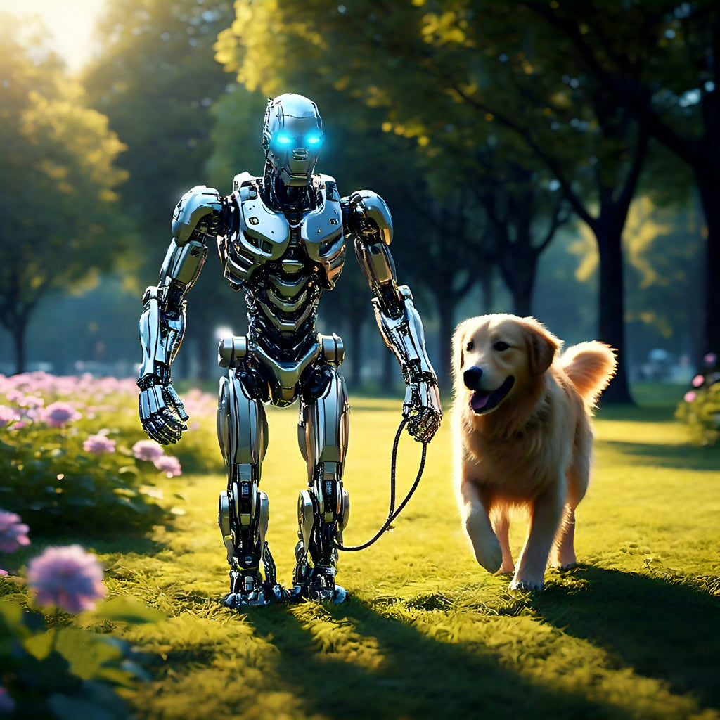 Step into the future of pet care with NeoPaw Guardian, the revolutionary AI-enhanced pet-walking assistant. Designed for seamless interaction with both pets and owners, this advanced robotic guardian ensures safety, fun, and companionship. Its sleek metallic frame, intelligent navigation system, and glowing blue eyes create a striking fusion of tech and functionality. Whether strolling through a park or patrolling a futuristic cityscape, NeoPaw Guardian is the perfect blend of innovation and devotion, redefining the way pets explore the world.