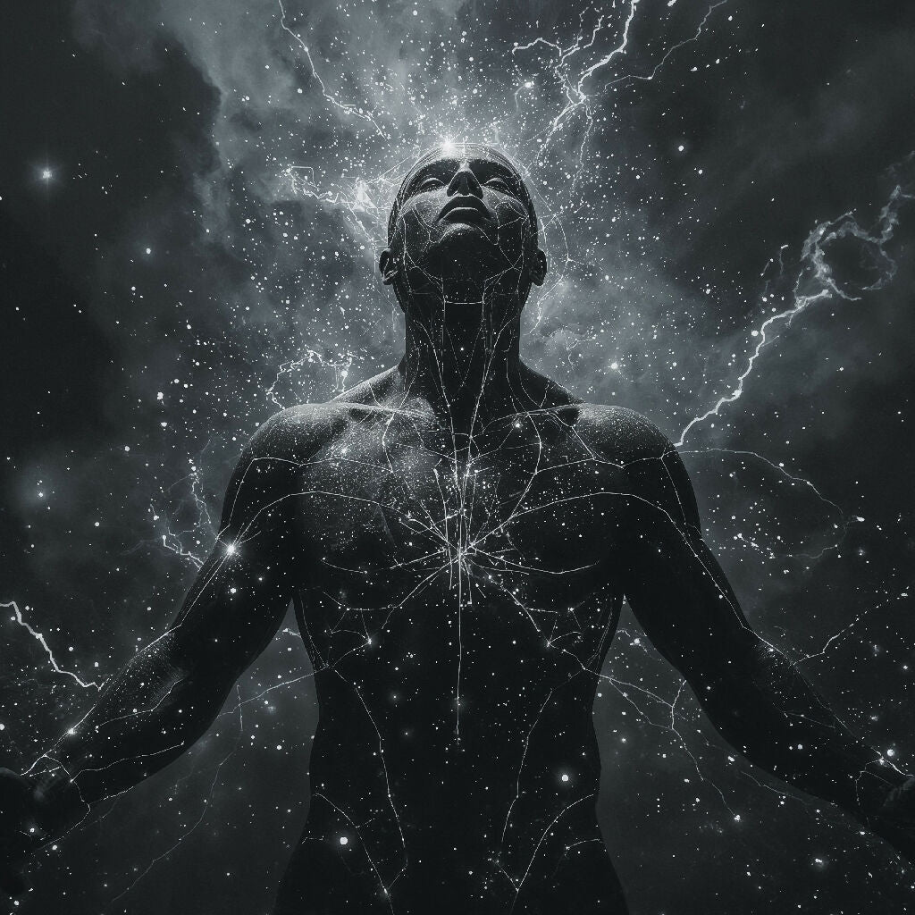 A human form dissolves into geometric networks of light, tracing pathways that echo both neural synapses and stellar formations. The figure tilts skyward in apparent transcendence, as luminous threads map the interior landscape of consciousness against a cosmic void. This visualization of thought made visible transforms the human body into a conduit between earthly and celestial realms. The intersecting lines suggest the mathematical precision underlying both cognition and cosmic order, while the figure's upward gaze implies aspiration toward higher understanding. The monochromatic palette emphasizes form over color, reducing existence to its essential patterns of connection and illumination.