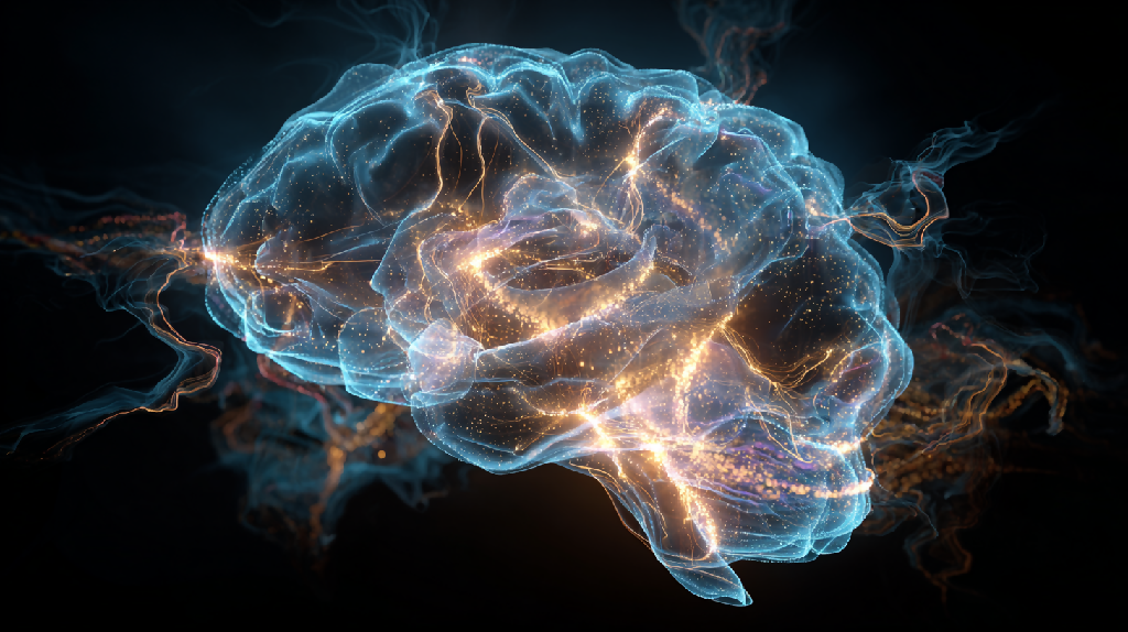 Style: Futuristic digital abstraction with anatomical and sci-fi elements. Inspired by neuroscience, cyberpunk aesthetics, and light-based data art. Emphasis on glow, symmetry, and ethereal textures.