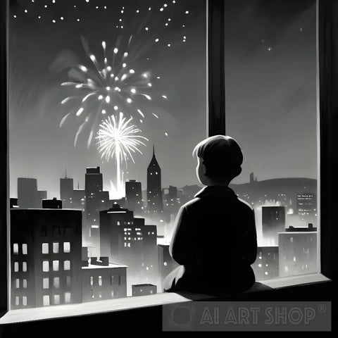 A monochromatic sketch in the style of Edward Hopper, capturing the quiet contemplation of a lone figure gazing out at a city skyline ablaze with New Year's Eve fireworks.