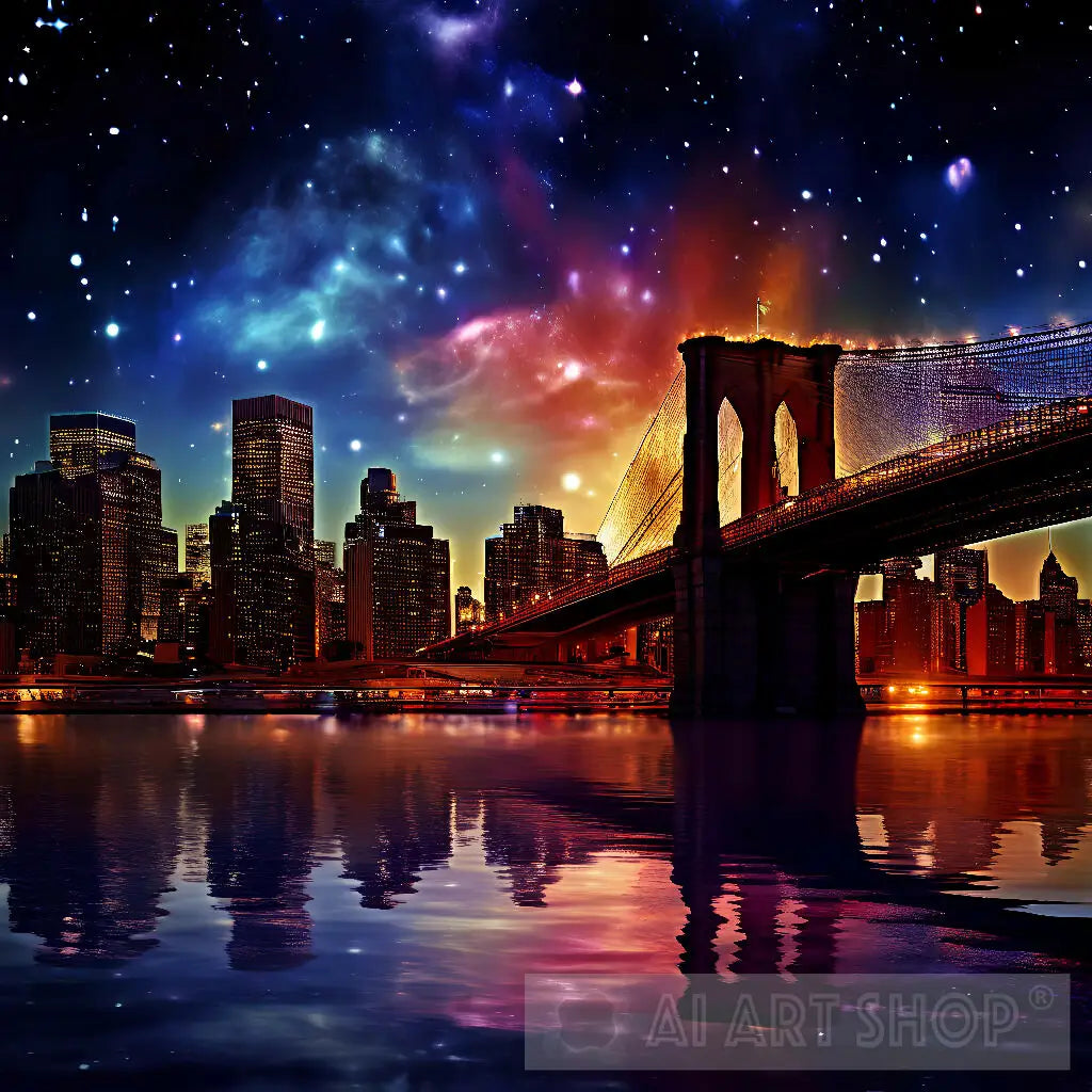 This breathtaking digital artwork depicts a futuristic cityscape set against a mesmerizing cosmic backdrop. The towering skyscrapers are reflected in a tranquil body of water, creating a surreal and visually stunning composition. The large, glowing moon and surrounding planets add an otherworldly element, evoking a sense of awe and wonder.This captivating image could be suitable for use in science fiction, fantasy, or space-themed creative projects, digital art, or advertising campaigns.