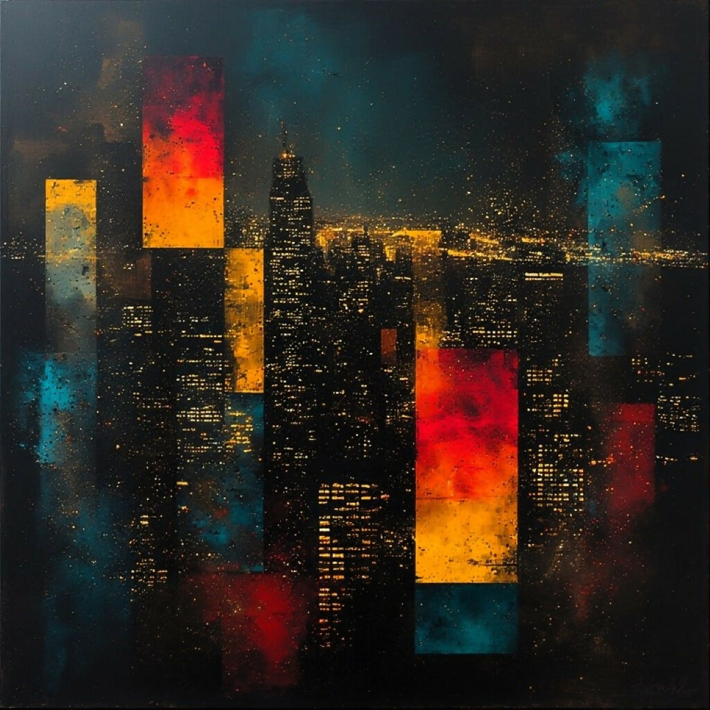 Adding a striking, abstract dimension to the urban panorama, bold, rectangular blocks of colour are artfully overlaid. These blocks, rendered in fiery reds, warm oranges, sunny yellows, and cool teals**, possess a distinct textured, spray-painted effect , giving them a raw, artistic edge.