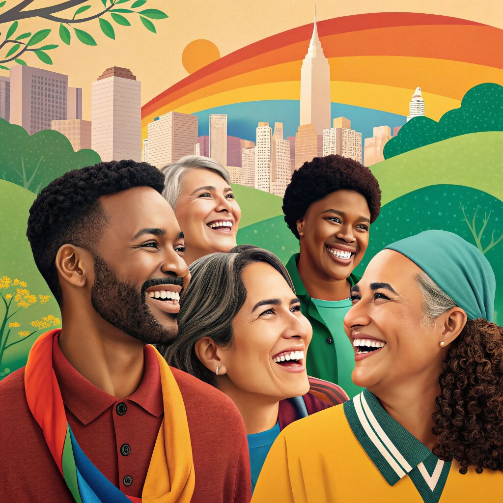 The people are wearing casual clothing; colours like burgundy, green, and mustard yellow are visible. One person is wearing a scarf or shawl with rainbow colours on it. The overall impression is one of joy, community, and diversity. The style of the illustration is bright and colourful.