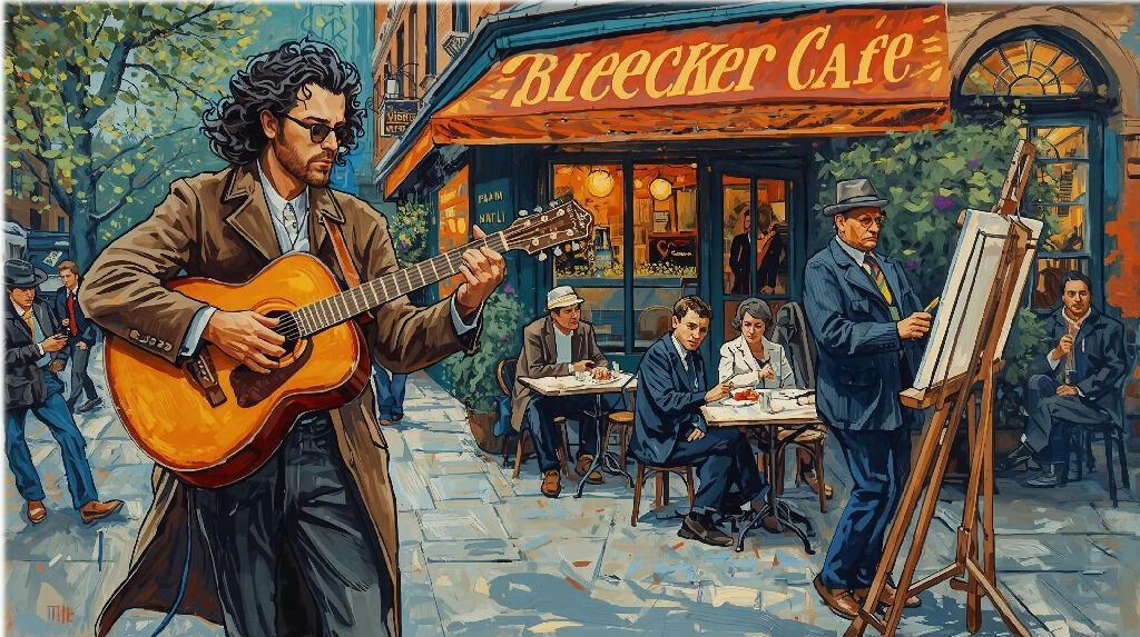 Vibrant painting with a musician playing his guitar and an artist painting in front of a cafe in the Greenwich Village section of Manhattan.