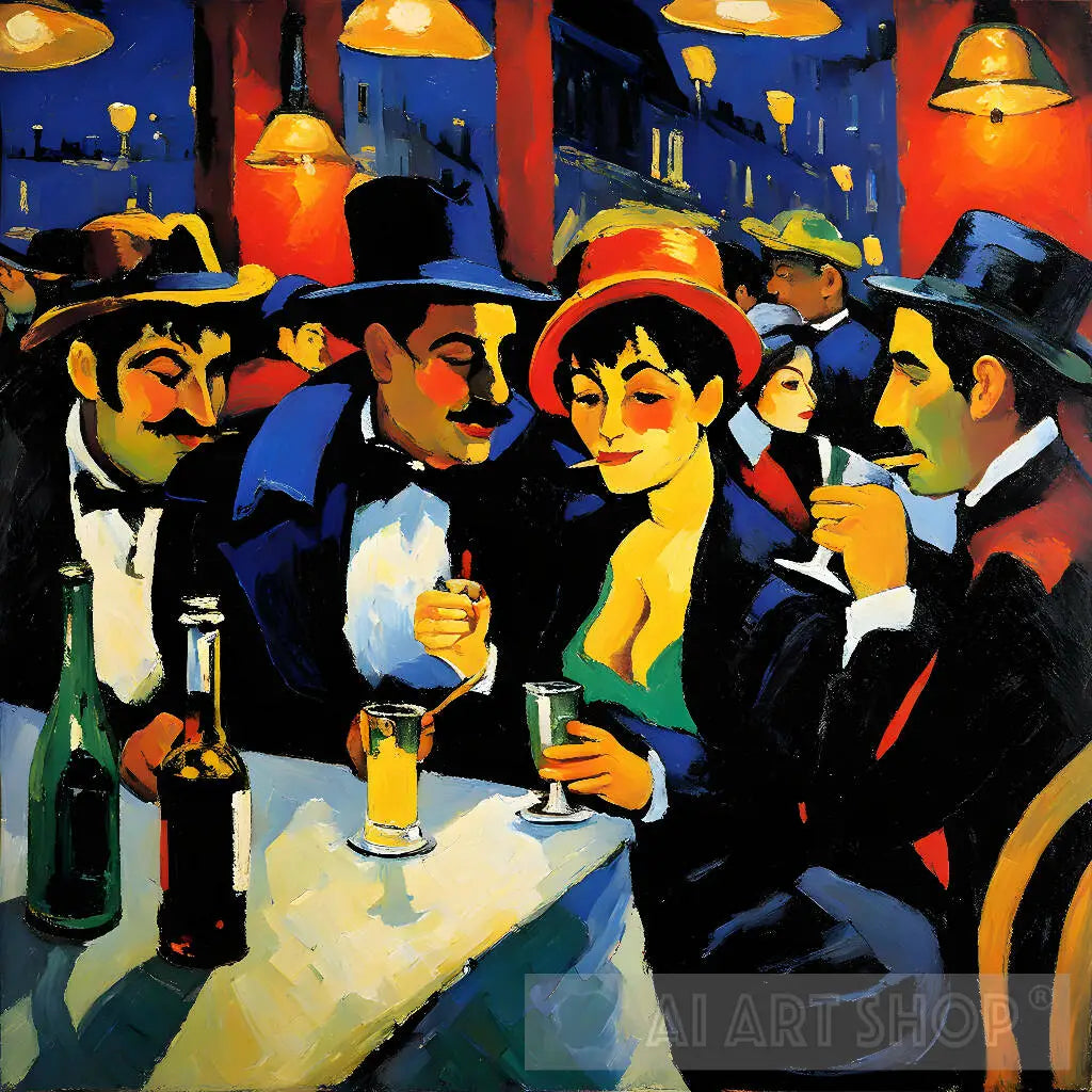 A vibrant oil painting of people drinking in the night cafe in Paris. The medium used is oil on canvas, capturing the rich and dynamic colors of the scene. The perspective is from within the cafe, giving the viewer a sense of being part of the lively atmosphere. Paul Gauguin's unique style is evident in the bold brushstrokes and vivid colors. The lighting is warm and inviting, with soft shadows adding depth to the composition. Inspired by Paul Gauguin's iconic paintings.