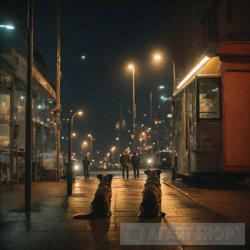 Late one night an old man observed a dog from far while the dog waiting at a bus stop, overhead view, only light from the fridge, comic book illustration style, simple, cute, full colors