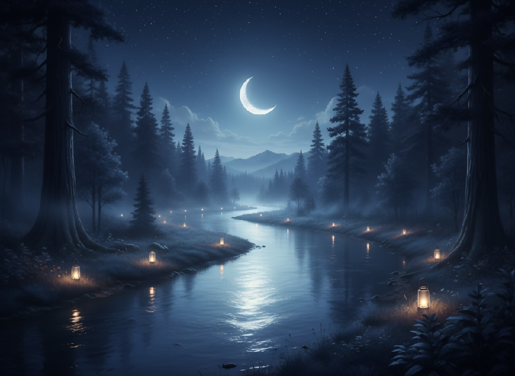 Let your imagination drift with Night River, a serene AI-generated digital painting that captures the quiet magic of a moonlit river winding through a forest at night. Cool tones of indigo, navy, and silver dance across the water’s surface, reflecting the soft glow of the moon and scattered stars above. Gentle mist rises from the riverbanks, while glowing lanterns or fireflies add warmth and wonder to the scene.
