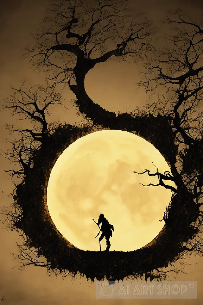 An ai generated artwork of a ninja silhouette with a moon shape on top.