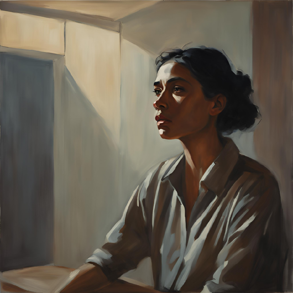 The art style of this is contemporary realism with an emphasis on chiaroscuro lighting. The use of soft, painterly brushstrokes, combined with a realistic depiction of the subject, suggests influences from classical portrait painting but with a modern, expressive touch. The strong contrasts between light and shadow evoke a sense of introspection and moodiness, reminiscent of works by old masters while maintaining a fresh, contemporary aesthetic.