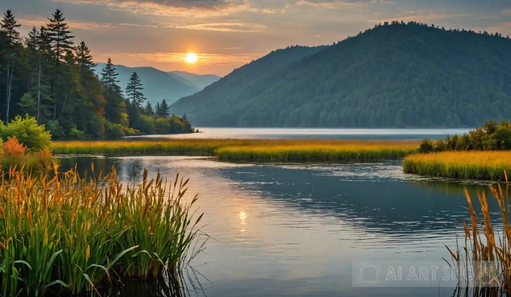 In the heart of the canvas, nature unveils its serene symphony—a tranquil mountain lake cradled by ancient forests, basking in the ethereal glow of sunset. Brushstrokes dance, capturing the essence of stillness and tranquility, as the rich hues of the twilight sky meld with the earthy tones of the land below. Wisps of clouds, like whispers of dreams, drift lazily overhead, casting gentle reflections upon the glassy surface of the water. In this moment, time stands still, and the world fades away, leaving only the profound beauty of nature's embrace—an oasis of peace and beauty inviting the weary soul to find solace.