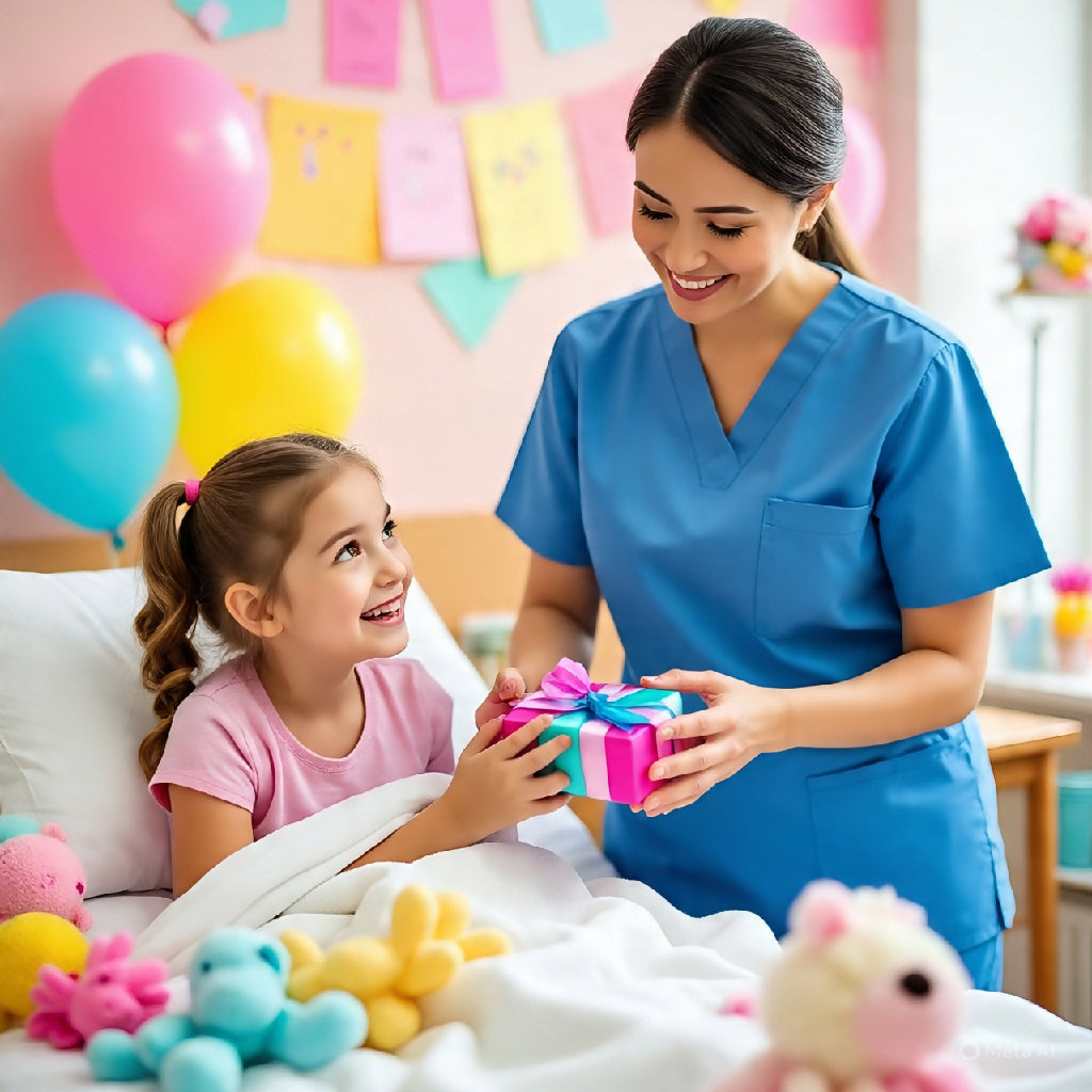 A smiling nurse in blue scrubs gives a colorful gift to a happy little girl in a hospital bed, surrounded by soft toys and balloons. This heartwarming image captures a moment of kindness and care in a pediatric hospital room, perfect for content related to children’s healthcare, hospital gift programs, pediatric nursing, or compassionate patient care.
