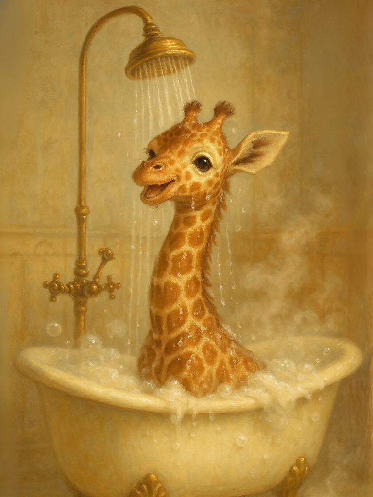 Brighten up your nursery or bathroom with this adorable Baby Giraffe in a Bathtub Digital Art! This charming digital download captures a whimsical moment of a cute giraffe enjoying a bubble bath in an antique clawfoot tub.