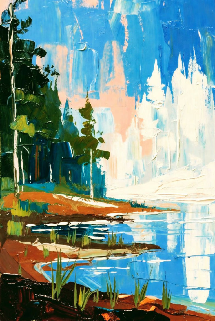 A beautiful nature scene painting, featuring a lake's bay and beautiful sky.