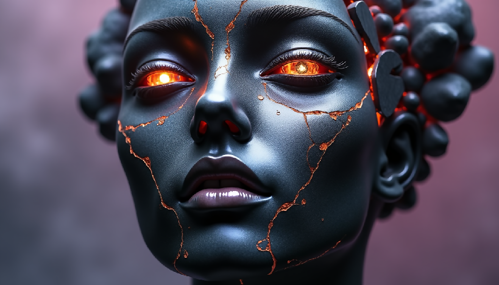 a women made of obsidian, she looks calm but cold and still there is a fire under the surface that breaks itself free...